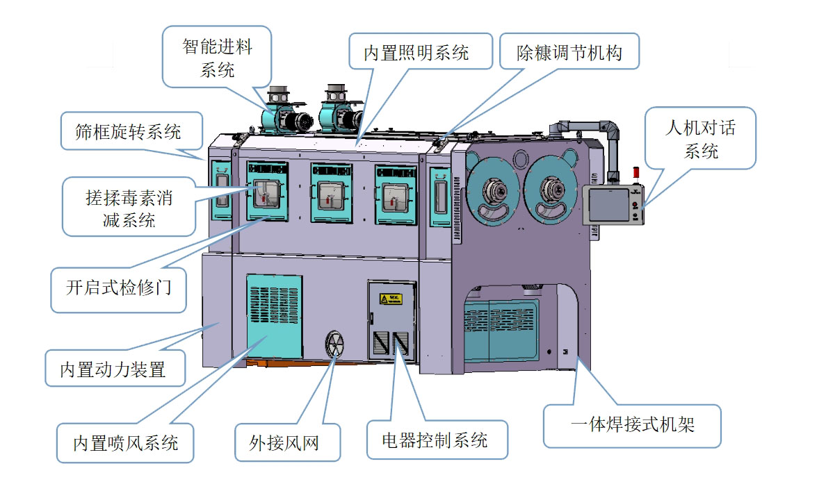 2、差速逆向金剛石搓板搓揉結構:物料經機械推動,高密度揉搓室及負壓的作用下,使附著在物料表面的真菌毒素分離并排出機外。